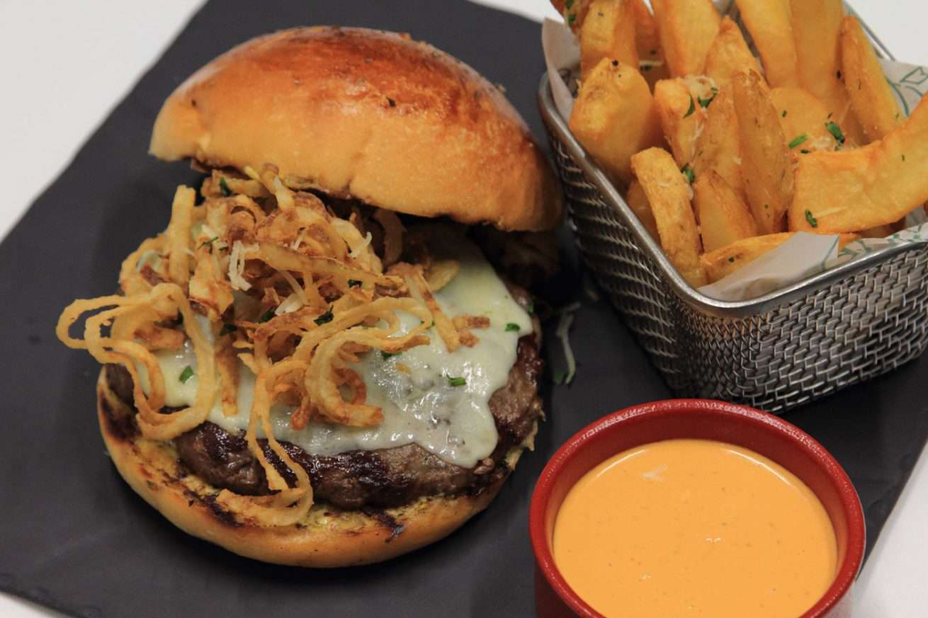 200 grs. de carne, provolone, bacon, cebolla caramelizada, mayonesa, tomate, fritas o rústicas